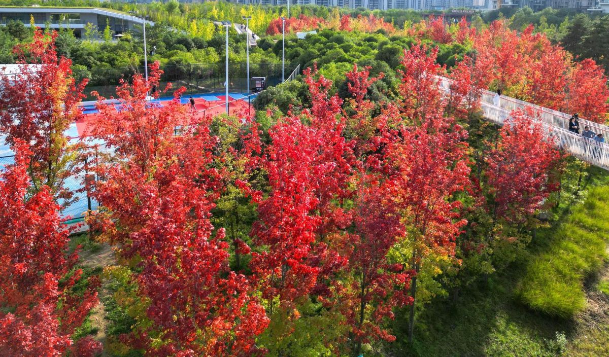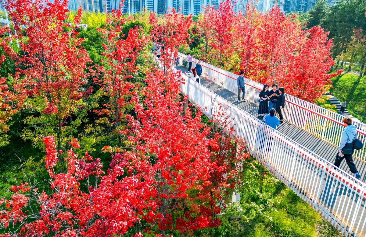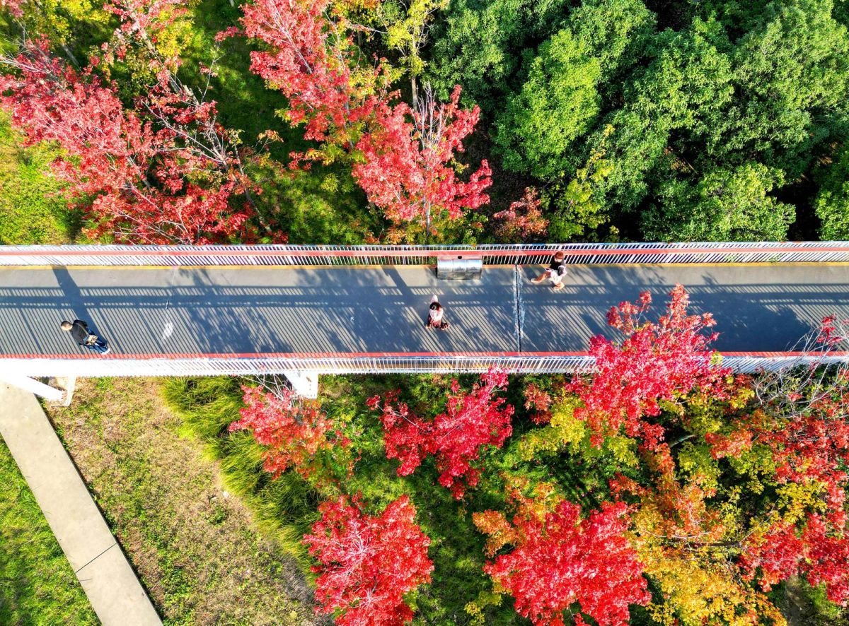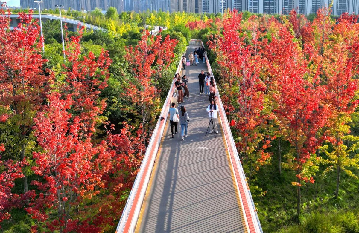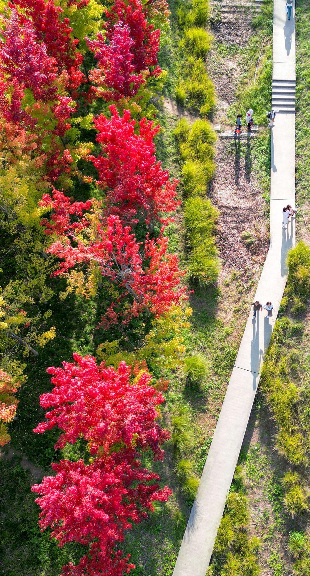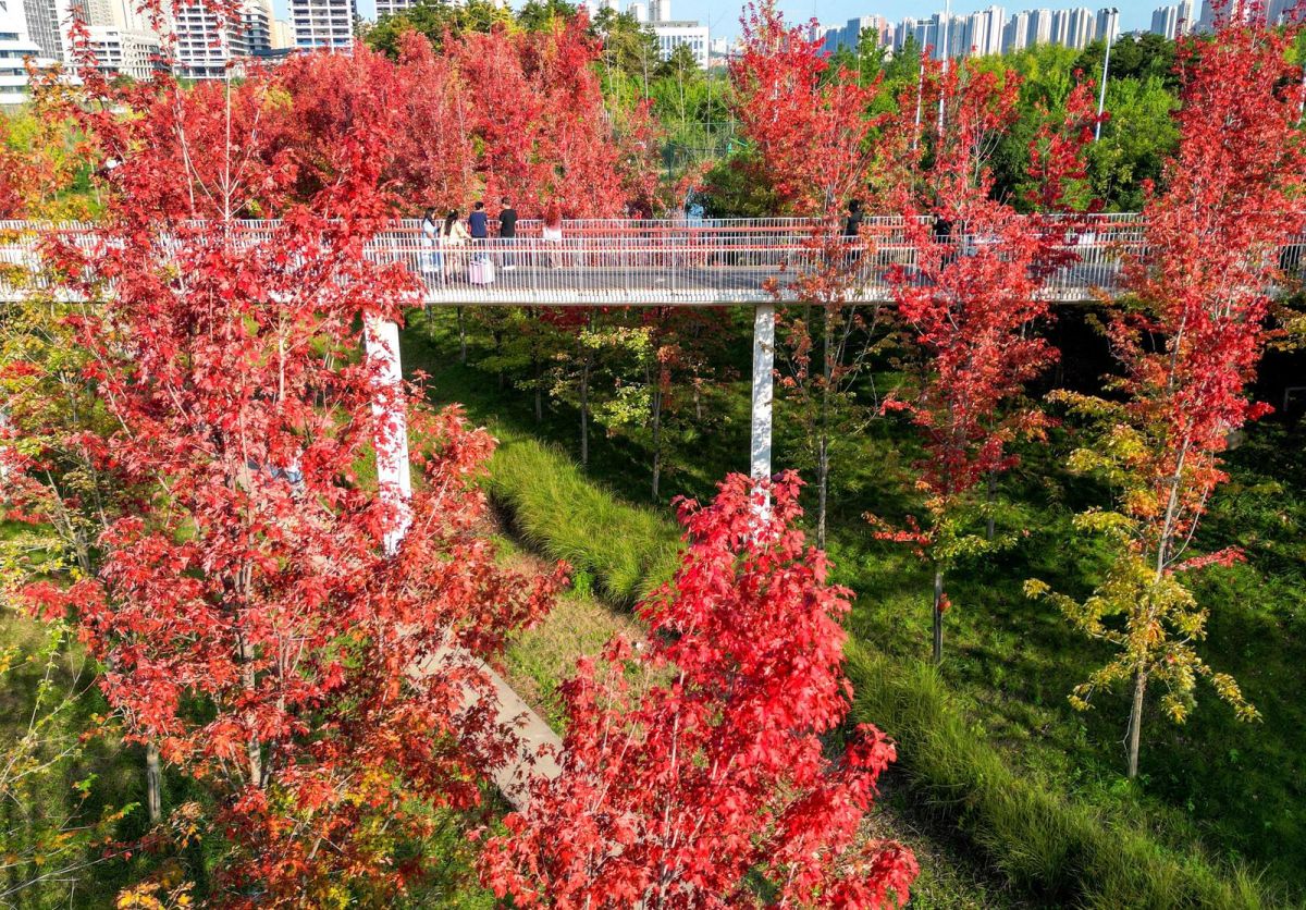 10月13日,秋雨短歇,雁南公园红叶开启“渐变模式”,即将迎来一年中最动人的时节。连绵的秋雨为整座西安浸染了更深的秋意,红叶褪去翠绿,正在换上热烈的红装,在轻柔的风中将秋日的氛围逐渐拉满。
