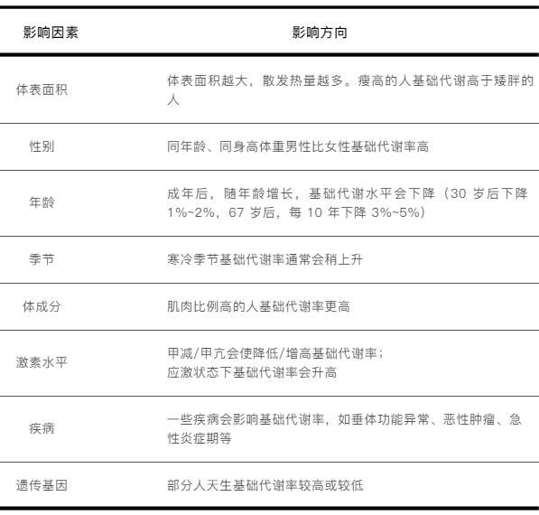 通常,人的基础代谢率和身高体重、年龄、性别、激素水平、季节、体成分(肌肉比例)、疾病状态等因素相关:
