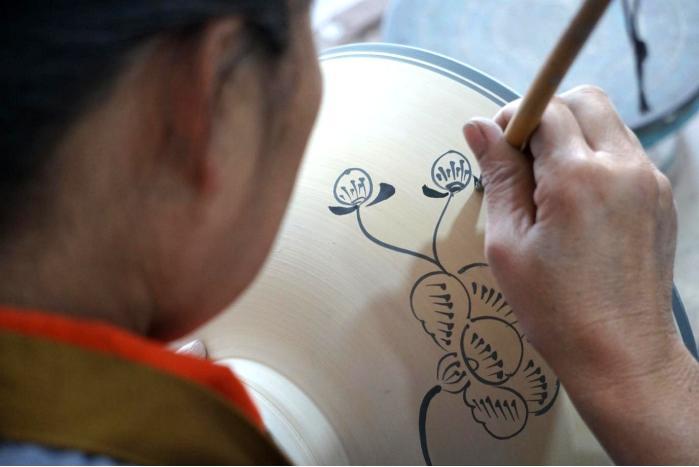 操作台上,几名匠人正熟练地为瓷坯进行纹饰勾画,笔尖蘸着青灰色料水,在素白的坯体上细细勾勒几笔,缠枝牡丹的图样便逐渐展现开来。