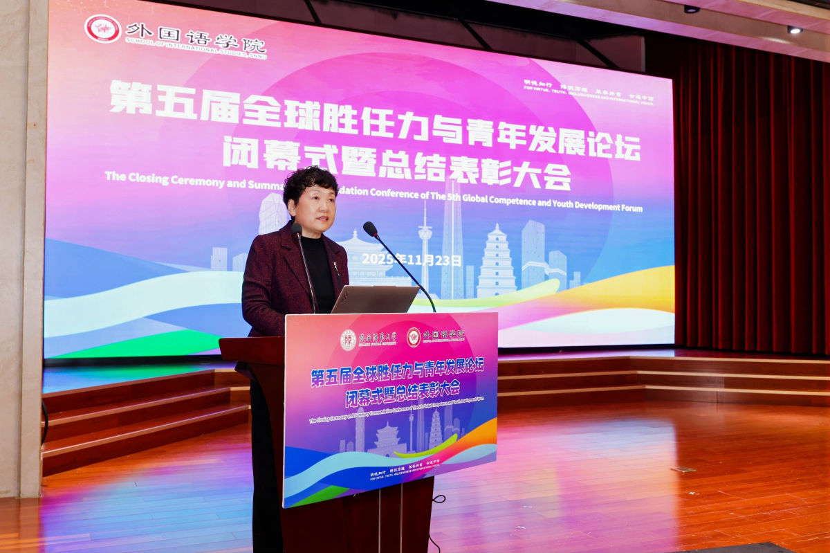 2025年11月23日,陕西师范大学外国语学院第五届“全球胜任力与青年发展”论坛闭幕式暨总结表彰大会在雁塔校区举行。陕西省委教育工委原副书记、陕西教育国际交流协会会长陈乃霞、陕西师范大学职能部门及外国语学院领导班子与200余名师生代表共同参加了本次总结大会。