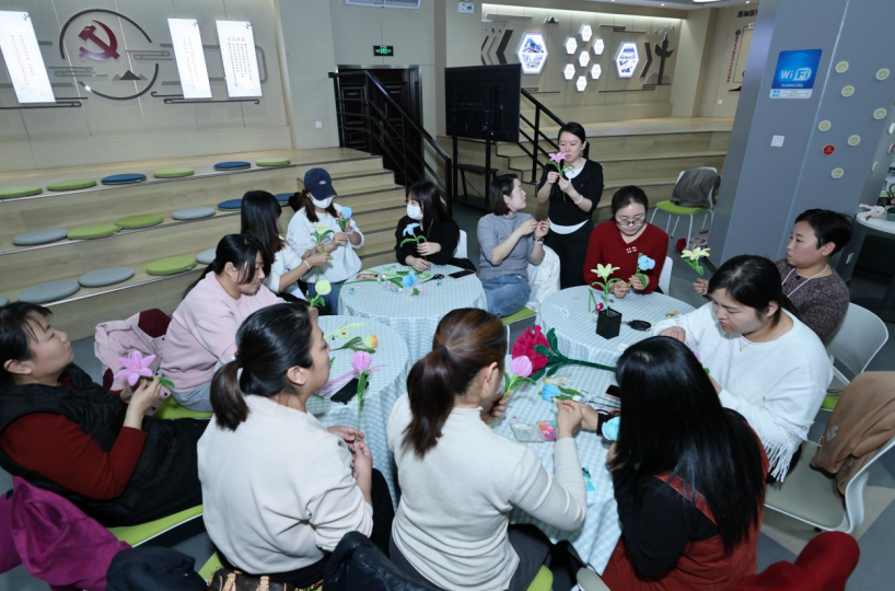 走进驿站,数十位社区居民正围坐在圆桌前,在老师的带领下专注地学习制作扭扭花,桌上剪刀、胶水、铁丝、扭棒等工具琳琅满目,一应俱全。