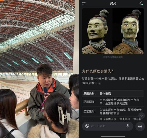 “以前讲解秦俑彩绘,只能靠图片和文字描述,游客很难有直观感受。”从事导游工作多年的小席,是馆内较早尝试AI工具的从业者之一。“借助灵光AI的图文、三维模型与智能识图能力,观众能够更直观地理解文物背后的历史细节与工艺特征。”
