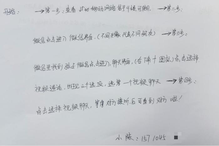 “阿姨,您这是没打开数据流量的开关。”更让老人感到贴心的是,陈仙仙并没有止步于解决问题。她留意到老人对智能手机的操作并不熟悉,便用A4纸以特大号字体手绘“视频通话流程图”,附上自己的电话表示随时联系,不仅帮助老人打消“怕忘记、怕搞错”的顾虑,还减少老人多次往返处理问题的周折。