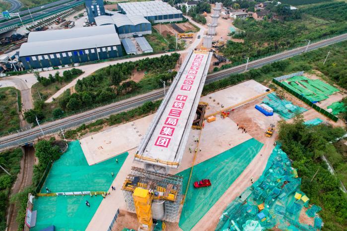 图为西延高铁跨省道107特大桥T构转体成功。