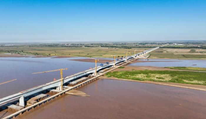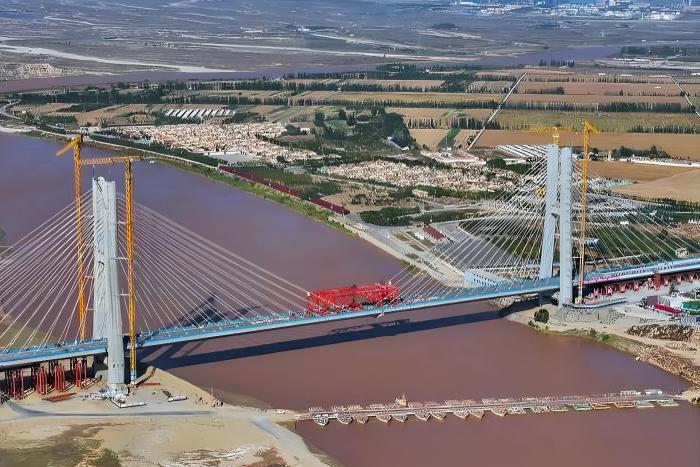 包银高铁起自包头站,经内蒙古自治区包头市、巴彦淖尔市、鄂尔多斯市、乌海市,宁夏回族自治区石嘴山市、银川市,接入银川站,正线全长519公里,设计时速250公里,沿途共设13座车站。在这一“超级工程”建设中,乌海黄河特大桥和磴口黄河特大桥作为全线“卡脖子”工程,建设难度大、施工条件艰苦、环保要求苛刻。承担施工任务的中铁宝桥路桥公司项目团队创新采用“纵向运输—整体提升—90度旋转”安装工艺,实现8000余吨钢梁“毫米级”安装,并全程避开黄河主航道,最大限度保护水域生态。在磴口黄河特大桥建设中,项目团队首创“配重提升法”,并借助BIM模拟与同步提升系统,在风沙大、昼夜温差达15℃的环境中,先后完成六次大节段整体提升,高效率、高精度完成了施工作业。
