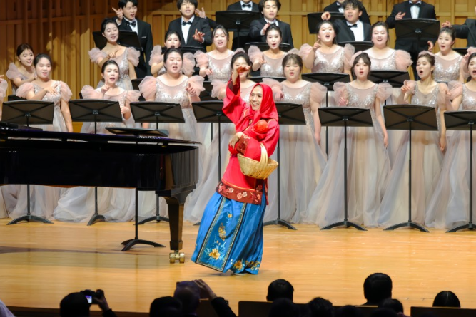 “左手一只鸡,右手一只鸭”,耳熟能详的民谣小调《回娘家》,合唱团同学们用美声唱法呈现,搭配上演员模仿动物的叫声,营造出新年到来之际一派热闹、鲜活的生活场景,也逗笑了全场的观众。