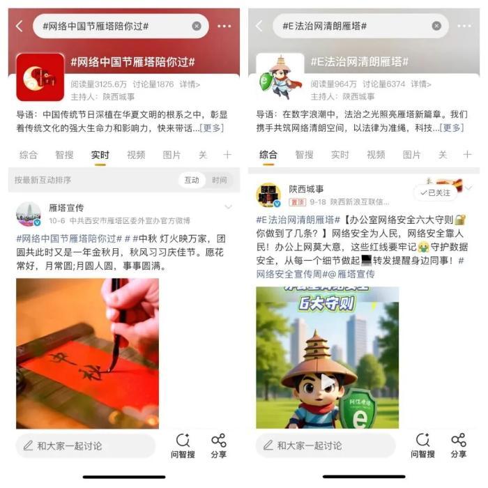 紧扣“一条主线”,加强网络空间思想引领。各区属政务新媒体平台围绕“深入贯彻中央八项规定精神学习教育”等重大主题开设专题专栏,其中“今日雁塔”微信公众号转发推送重点稿件重要信息230余条次;辖区网络名人积极参与“纪念中国人民抗日战争暨世界反法西斯战争胜利80周年”等网络正能量传播互动,影响覆盖人群达335.6万。