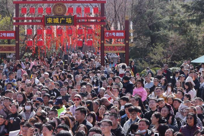 图为春节期间,西安千古情景区内人头攒动。
