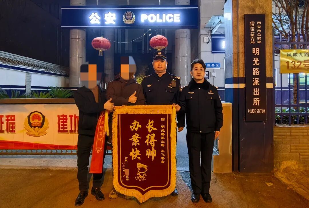 近日,西安市公安局经开分局明光路派出所收到市民李先生、徐先生送来的一面印有“长得帅 办案快”的锦旗,以此感谢民警王飞高效履职,及时为他们挽回经济损失。这面别具心意的锦旗,不仅是群众对公安工作的真挚认可,也生动体现了警民之间的深厚情谊。