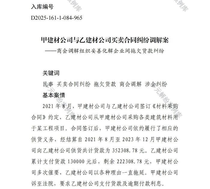 近日,西安市雁塔区人民法院报送的《甲建材公司与乙建材公司买卖合同纠纷调解案——商会调解组织妥善化解企业间拖欠货款纠纷》案例,入选最高人民法院多元解纷案例库,入库编号为 D2025-161-1-084-965。