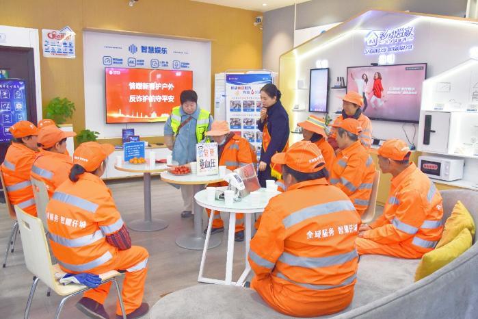 商洛商南分公司青年志愿者将营业厅设为“学雷锋志愿服务台席”,为进厅老年客户免费测量血压、指导手机操作、发放宣传资料,开展反诈提醒。同时,邀请环卫工人等群体走进营业厅“爱心驿站”,提供热水等便民服务。