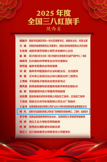 3月2日,中华全国妇女联合会发布2025年度全国三八红旗手标兵、全国三八红旗手、全国三八红旗集体、全国巾帼文明岗全名单,陕西共有19人荣获全国三八红旗手称号,来自西安经开区企业陕汽控股的技术骨干樊凡成功入选,成为全国优秀杰出女性代表。